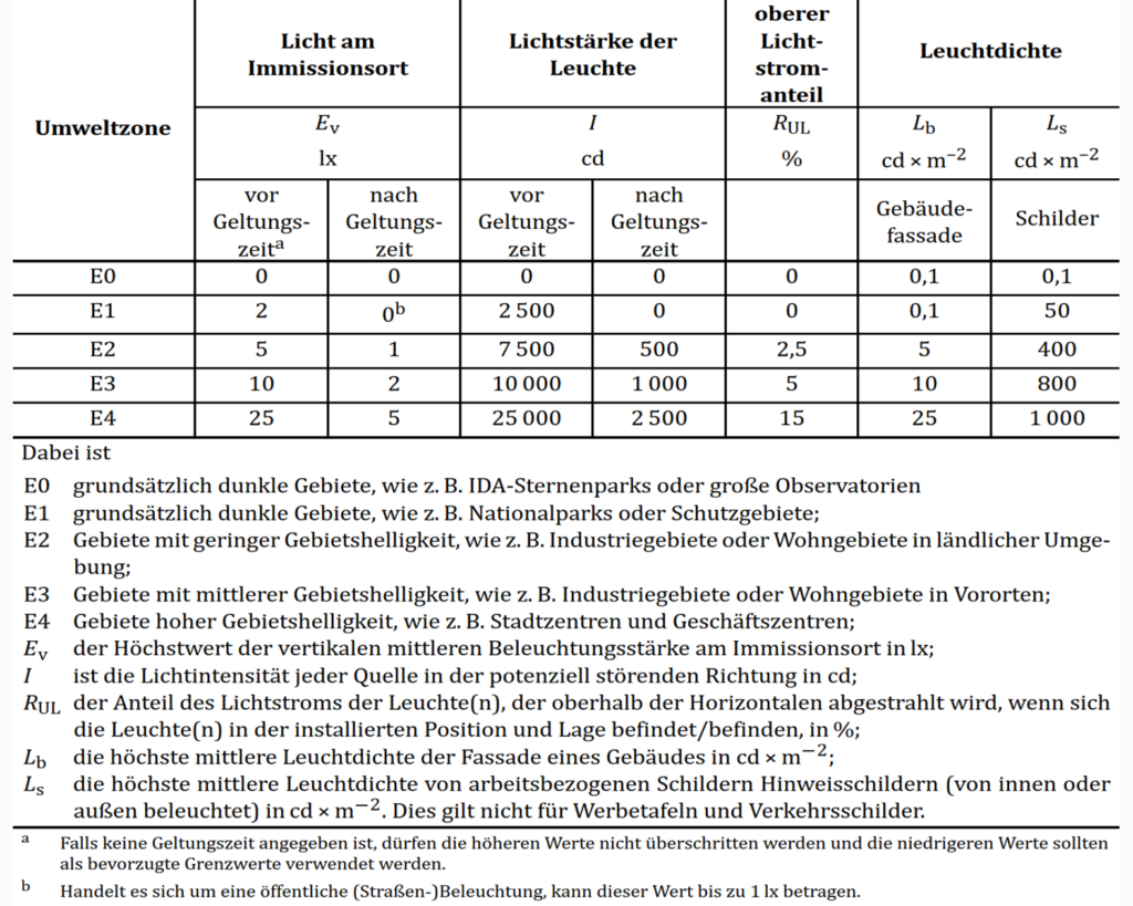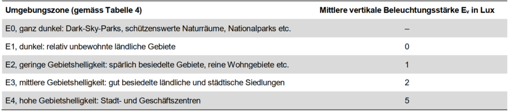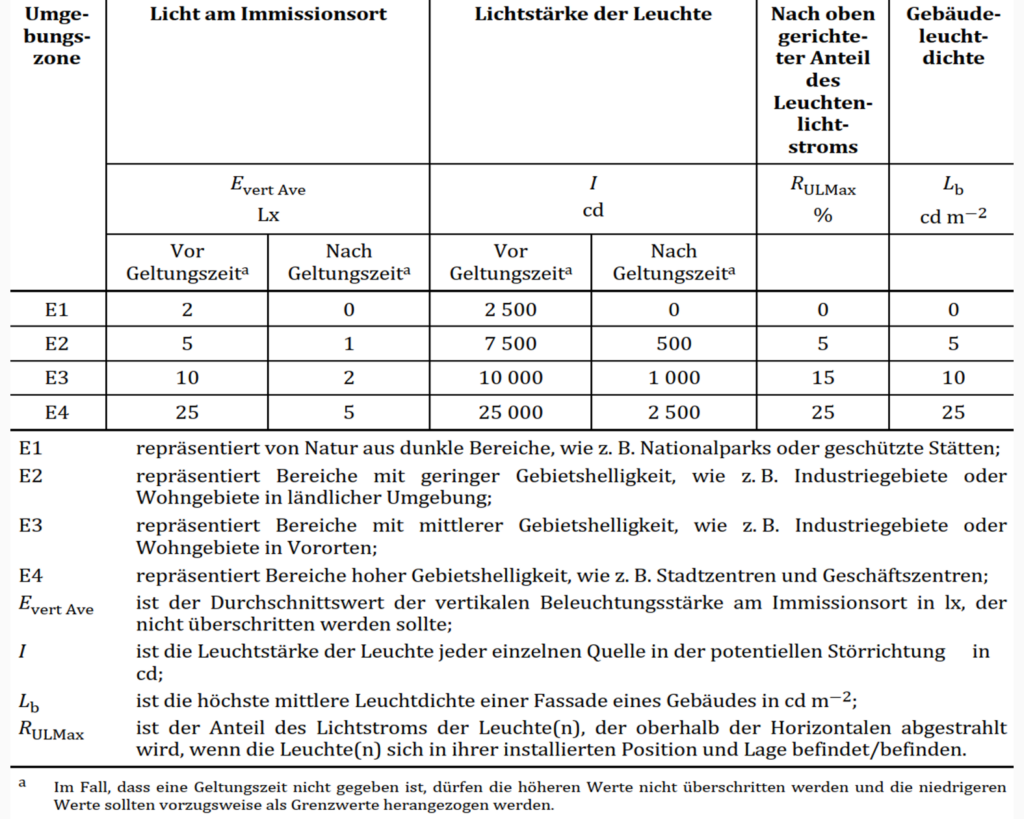 Grenzwerte für das Störlicht werden aber in Normen genannt. Einerseits die SN EN 12464-2:2024 Licht und Beleuchtung – Beleuchtung von Arbeitsstätten – Teil 2: Arbeitsplätze im Freien und anderseits in der SN EN 12193:2018 Licht und Beleuchtung – Sportstättenbeleuchtung. Beide Grenzwertetabellen siehe unten.