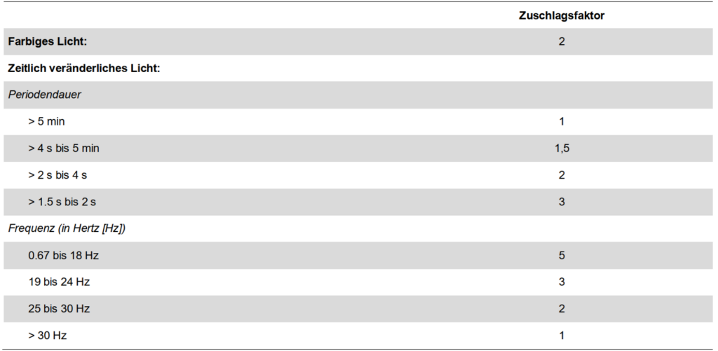Abb. 1 | Störlichttabelle aus der SN EN 12464-2 Licht und Beleuchtung – Beleuchtung von Arbeitsstätten – Teil 2: Arbeitsplätze im Freien (Tabelle 4, S. 18)