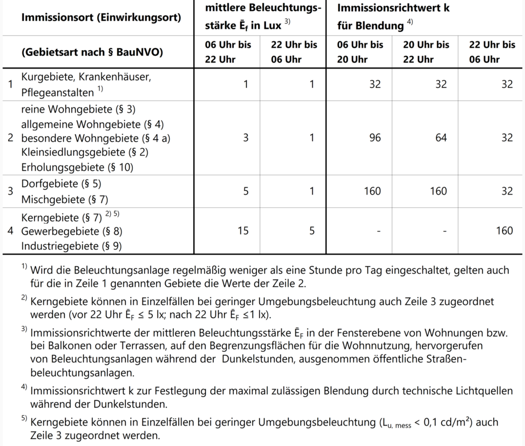 2012 (revidiert 2015) wurde die Wegleitung Hinweise zur Messung, Beurteilung und Minderung von Lichtemissionen publiziert. Darin sind die in Deutschland angewendeten Grenzwerte definiert. Die Gebietsarten sind aus der Verordnung über die bauliche Nutzung der Grundstücke (Baunutzungsverordnung – BauNVO) abgeleitet.